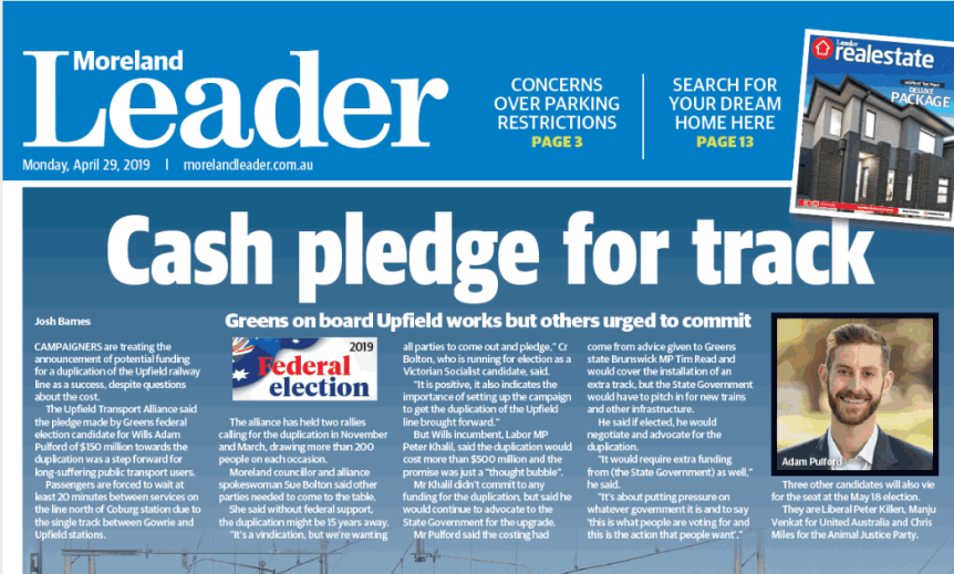Adam Pulford highlighted the high priority need for track duplication and the announcement that the Greens would federally fund $150 million towards the track duplication, and highlighted the report in the Moreland Leader.