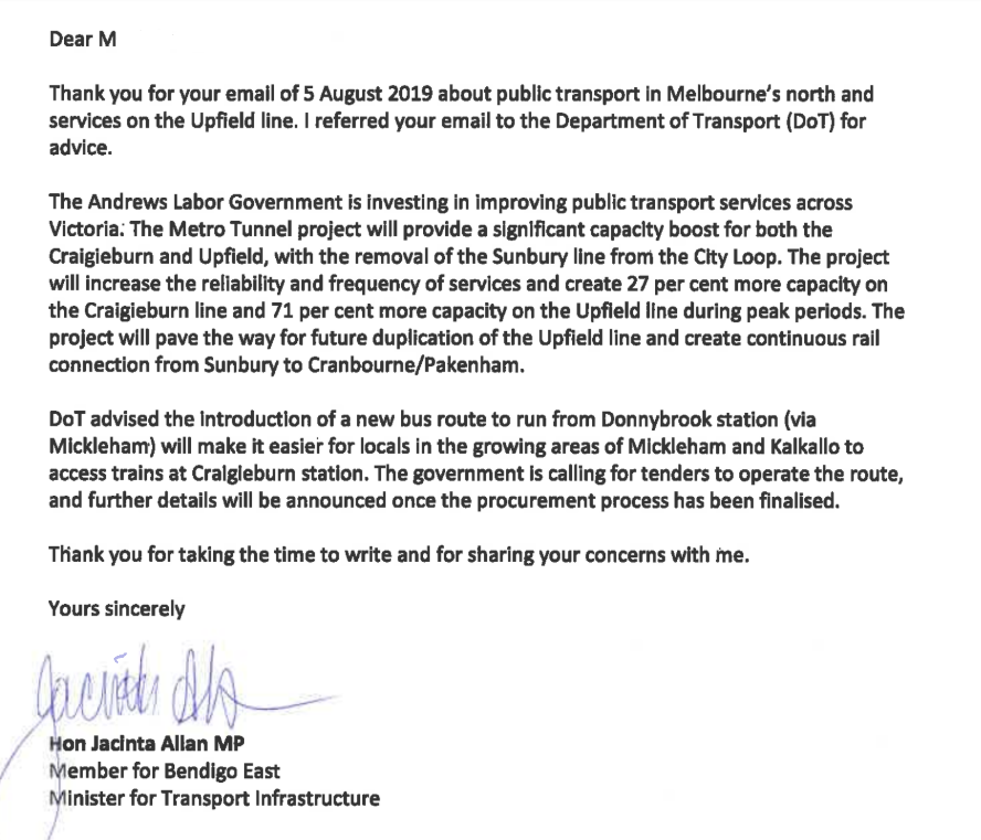 We also wrote to Transport Infrastructure Minister Jacinta Allan to explain why passengers were so unhappy and how an infrequent, unreliable service was disrupting lives.